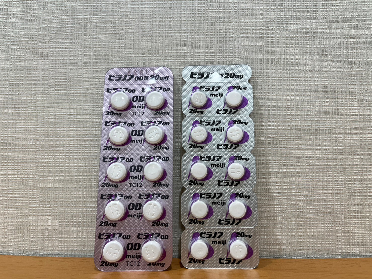 | 形状の種類 | 通常の「ビラノア錠20mg」に加え、2021年には水なしで服用できる「ビラノアOD錠20mg(口腔内崩壊錠)」が登場しました。OD錠は口の中ですぐに溶けるので、外出先の水などが無い状況でも即座に服用可能です。 |
