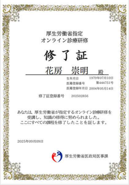オンライン診療は、予約から受診、支払いまでをインターネットを通してビデオ通話で行うことができる新しい通院のかたちです。当院は患者様の利便性向上を目的とし、保険診療、自由診療の診察をオンライン診療で行っております。当院は厚生労働省が指定したオンライン診療研修を正式に修了しております。