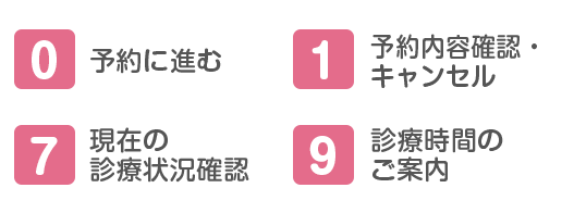 予約の受付は「0」を押してください。その他、受付後の予約番号の確認・キャンセル等も可能です。